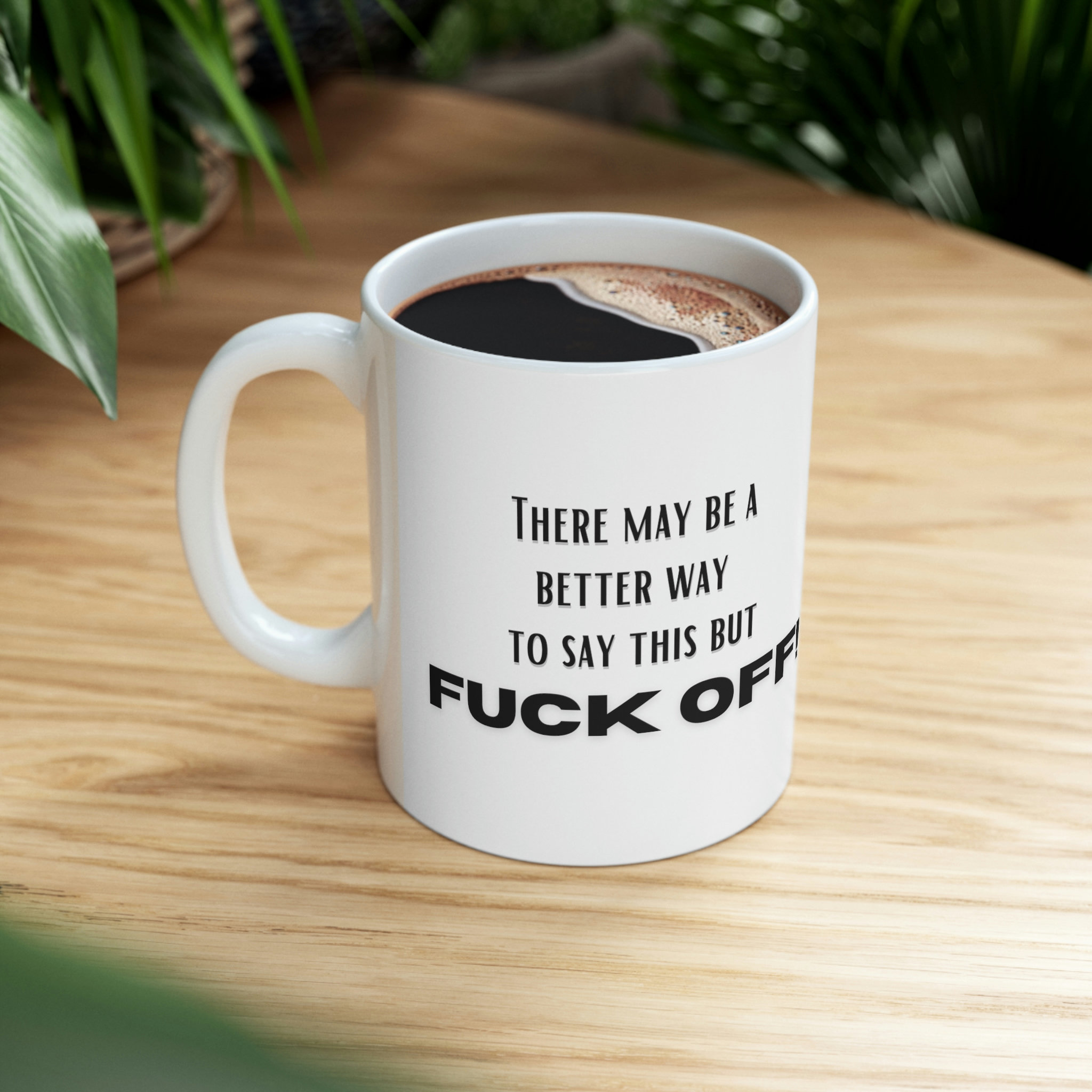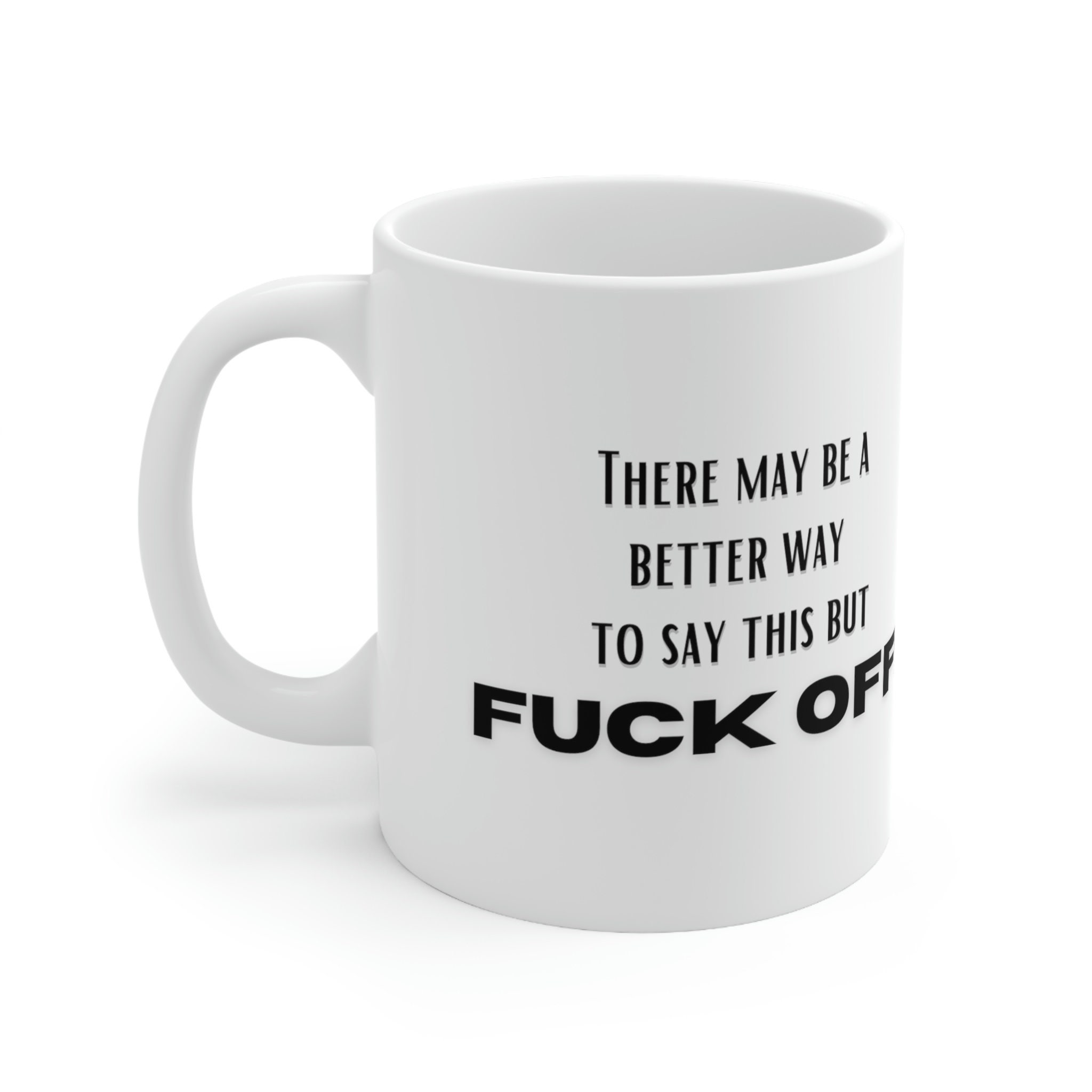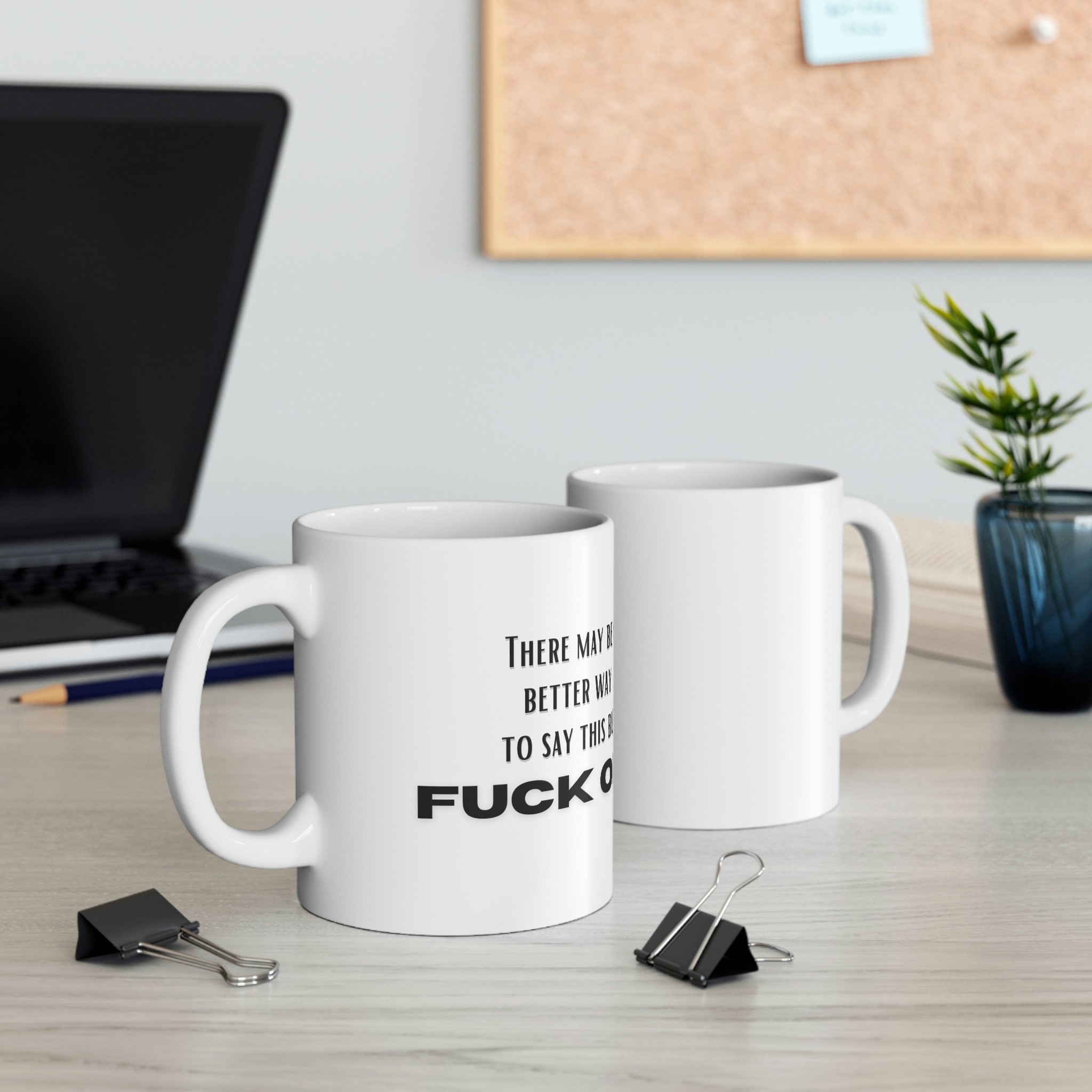 "There may be a better way of saying this but, fuck off!" This funny cup is BPA and Lead-free, microwave & dishwasher-safe, and made of white, durable ceramic in an 11-ounce size. A humorous gift for coffee, tea, and chocolate lovers.